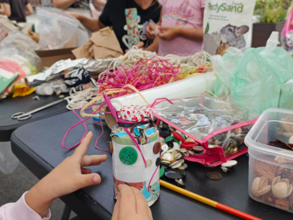 Pierwszy warsztat poświęcony był tworzeniu prostych instrumentów muzycznych z materiałów z recyklingu. W wydarzeniu uczestniczyły dzieci wraz z rodzicami, dziadkami oraz osoby dorosłe z niepełnosprawnościami intelektualnymi i ich opiekunowie. Część osób dowiedziała się o wydarzeniu z mediów społecznościowych i plakatów informacyjnych, inni dołączyli spontanicznie. Podczas zajęć wykorzystano materiały pochodzące z odzysku, przyniesione przez prowadzących i uczestników. Po wykonaniu instrumentów wszyscy mieli okazję wspólnie zagrać przy akompaniamencie gitary. W warsztacie uczestniczyło ok. 30 osób. Działanie zrealizowało założone cele w zakresie edukacji ekologicznej i integracji międzypokoleniowej.