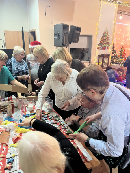 Dużym zainteresowaniem cieszyły się warsztaty dekorowania pierników, w których wspólnie uczestniczyły dzieci, dorośli i seniorzy. Przy stołach pełnych lukru, kolorowych posypek i pierników powstawały małe dzieła sztuki – a przy okazji rozmowy, śmiech i międzypokoleniowa współpraca.